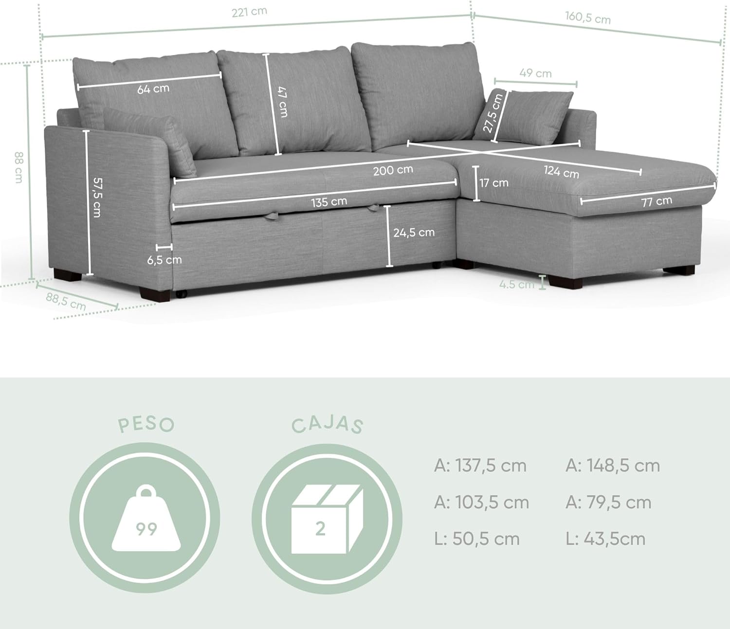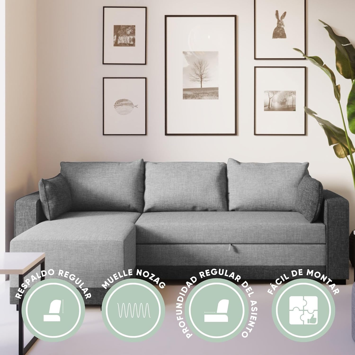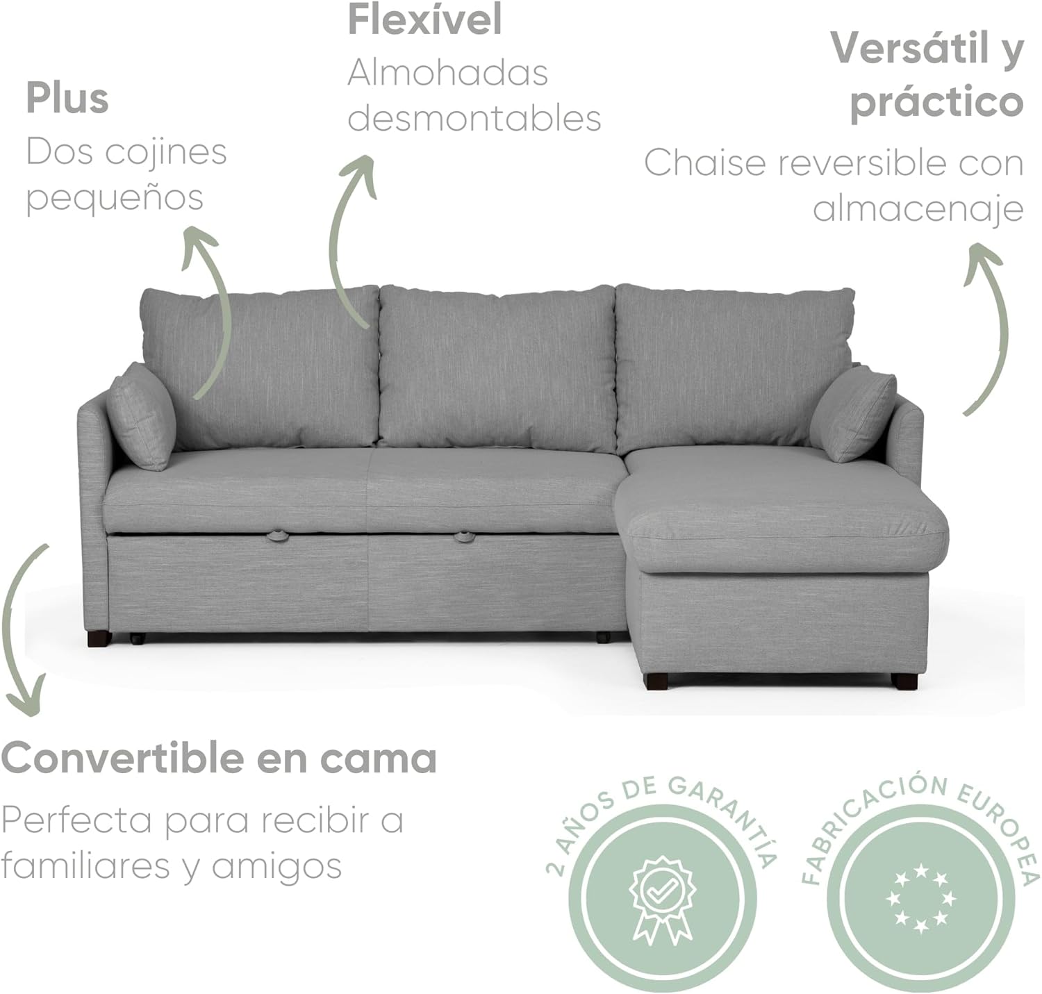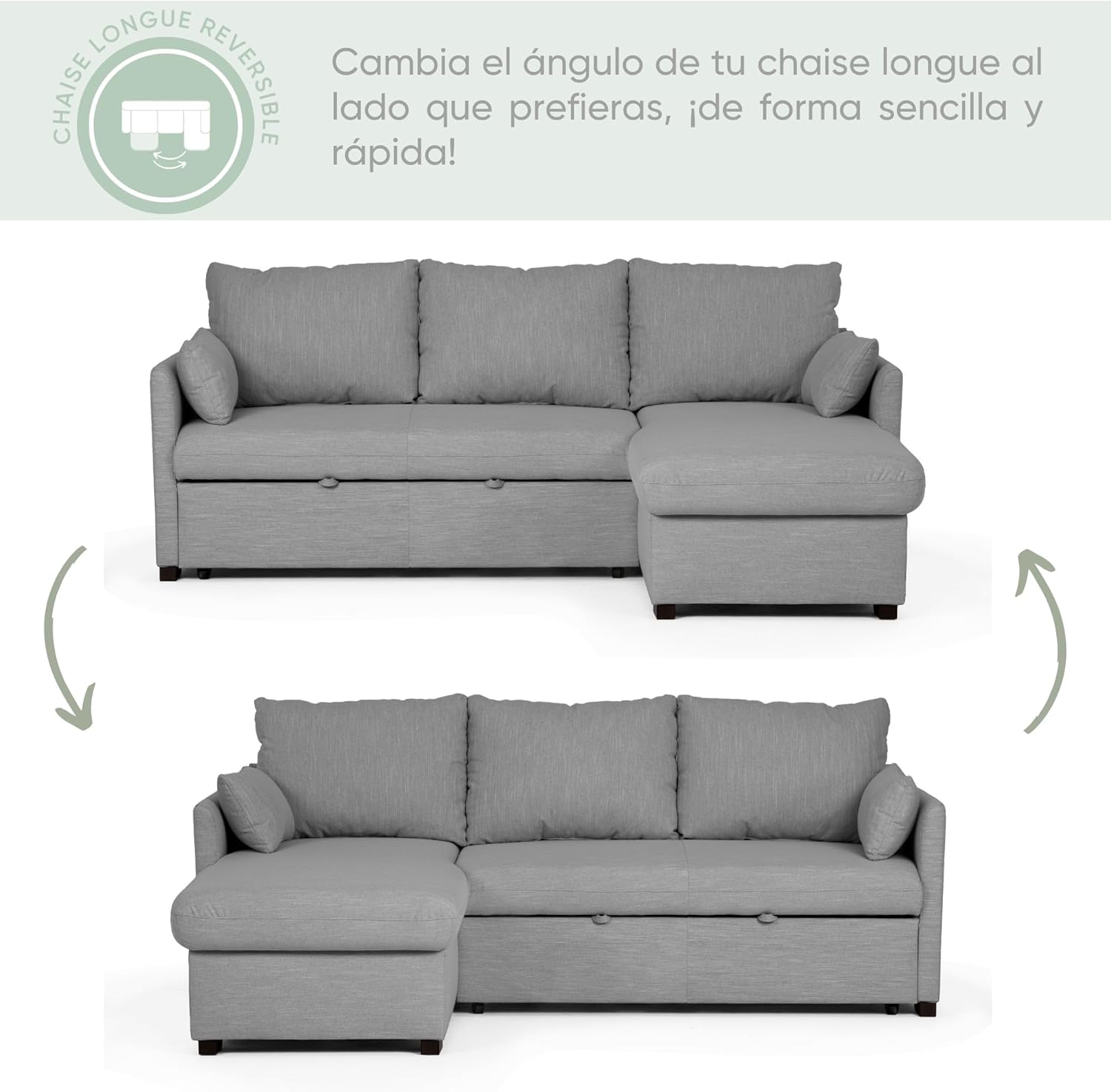 - ✅ ESTILO Y FUNCIONALIDAD – Con chaise longue reversible y almacenaje, este sofá es ideal para quienes buscan estilo y funcionalidad en cualquier ambiente, desde salones a espacios más pequeños. Las dos confortables almohadas sueltas ofrecen una experiencia acogedora y permiten un ajuste personalizado para mayor confort. El práctico almacenamiento le permite guardar mantas, cojines u otros objetos, manteniendo su espacio organizado de manera fácil y discreta.