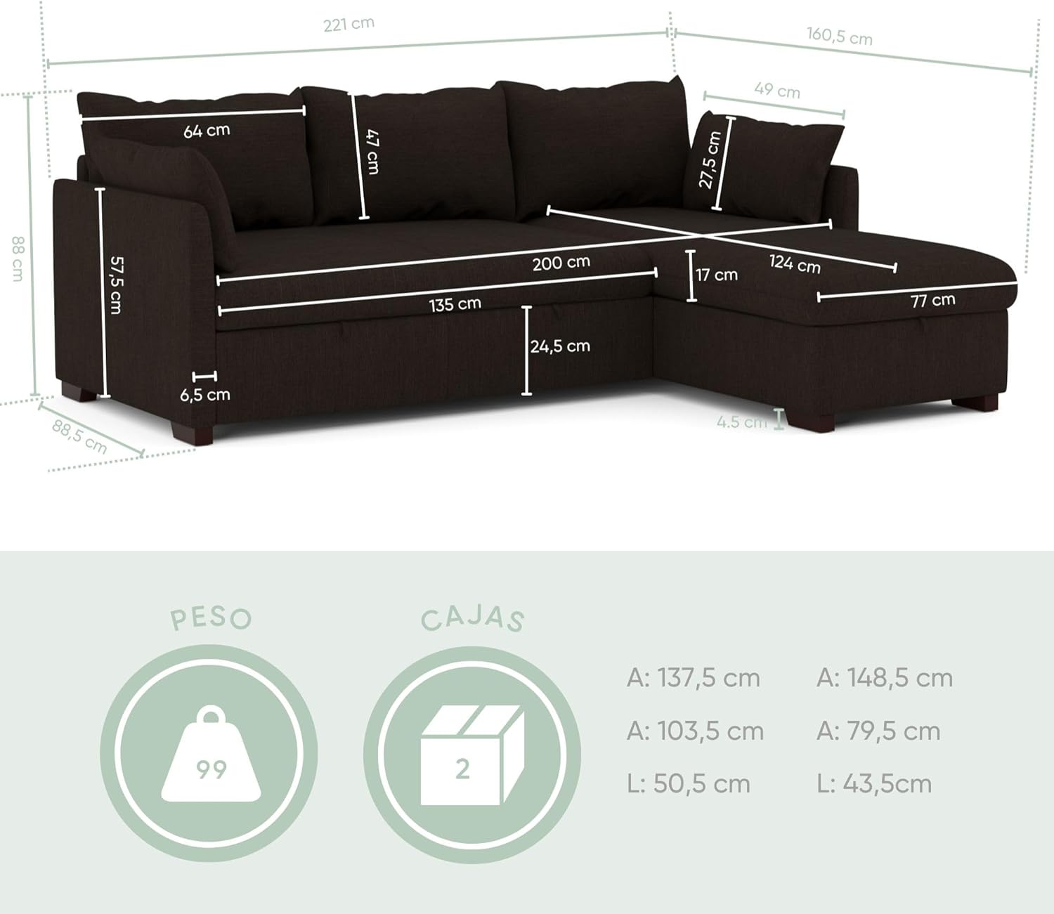 • ✅ ESTILO Y FUNCIONALIDAD – Con chaise longue reversible y almacenaje, este sofá es ideal para quienes buscan estilo y funcionalidad en cualquier ambiente, desde salones a espacios más pequeños. Las dos confortables almohadas sueltas ofrecen una experiencia acogedora y permiten un ajuste personalizado para mayor confort. El práctico almacenamiento le permite guardar mantas, cojines u otros objetos, manteniendo su espacio organizado de manera fácil y discreta.